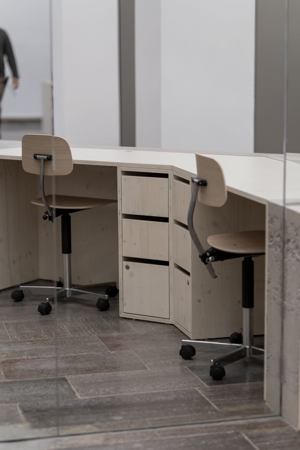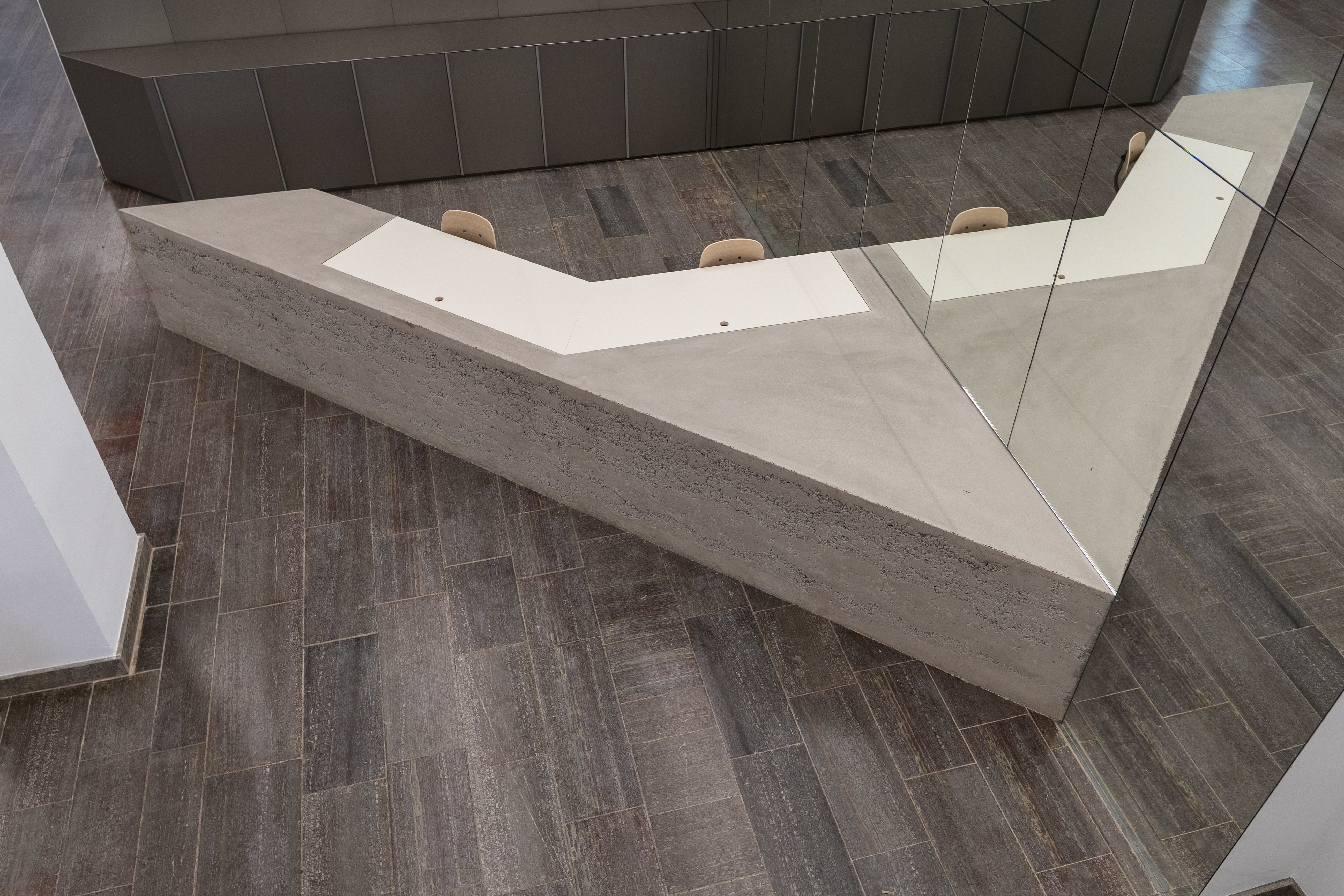 Rezeptionstisch in weiß geölter Fichte, Arbeitsfläche beschichtet mit Noraplan Uni 2446.